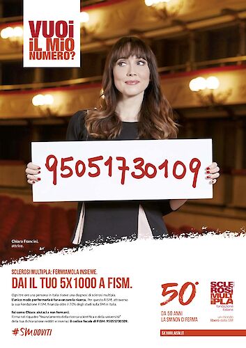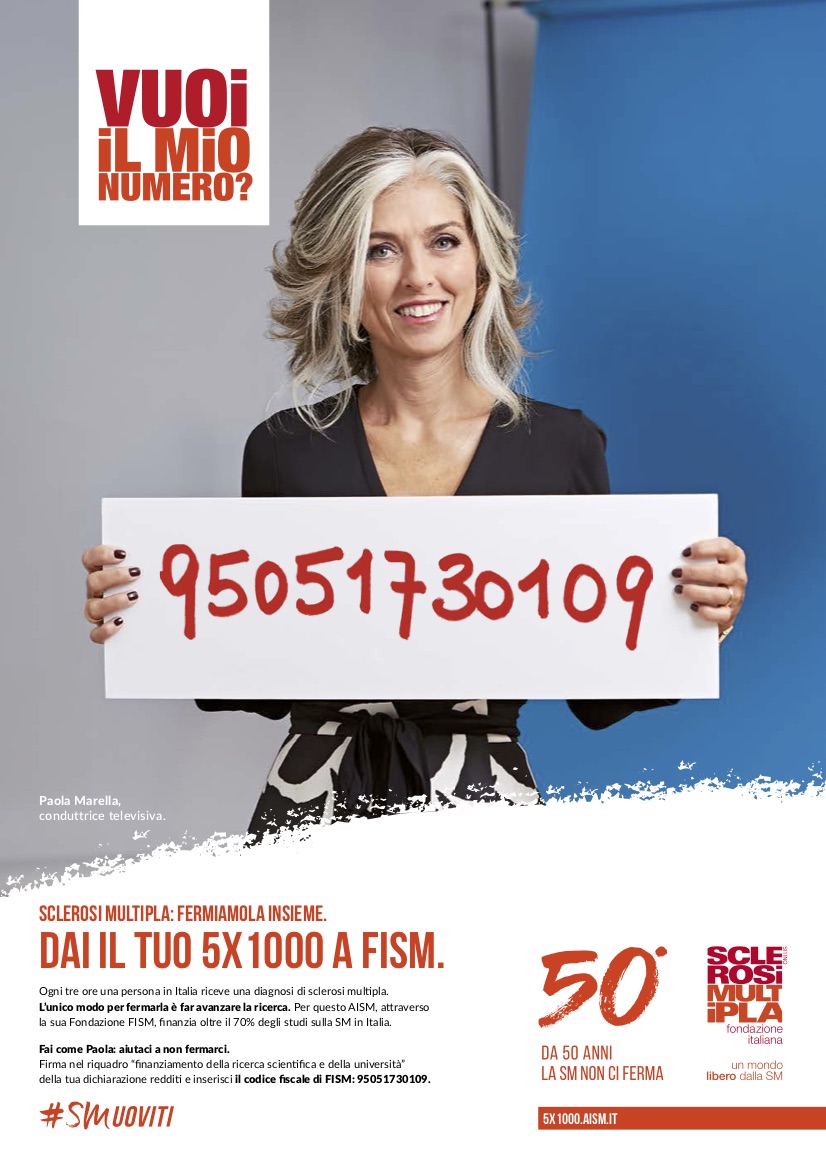 “Vuoi il mio numero?” è la campagna per il 5X1000 a FISM, nata nel 2012 per raccogliere fondi per finanziare la ricerca contro la sclerosi multipla. In questi anni numerosi personaggi famosi e non hanno prestato il loro volto per questa efficace campagna di comunicazione regalandoci un sorriso ed aiutandoci a diffondere la nostra causa.