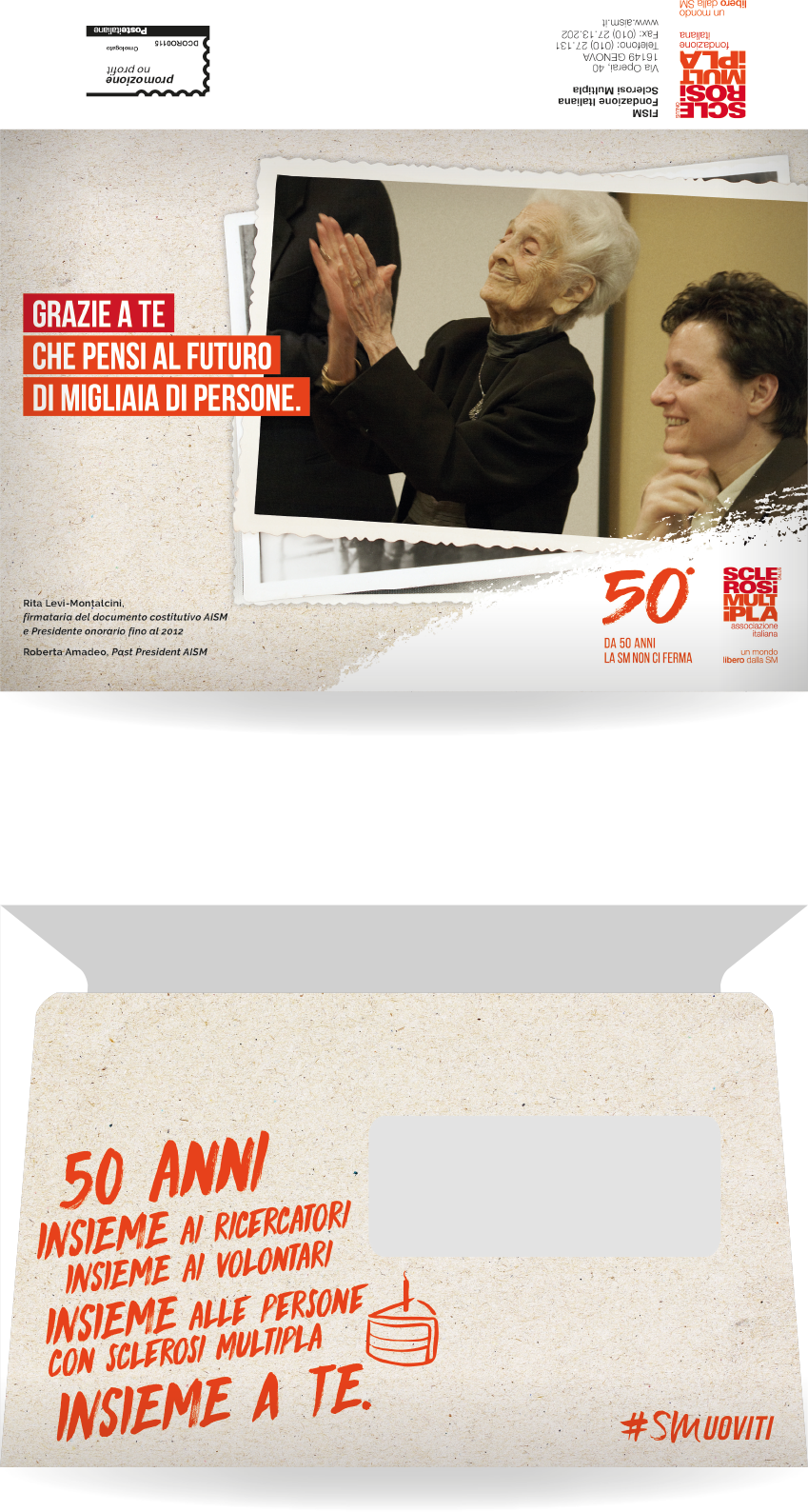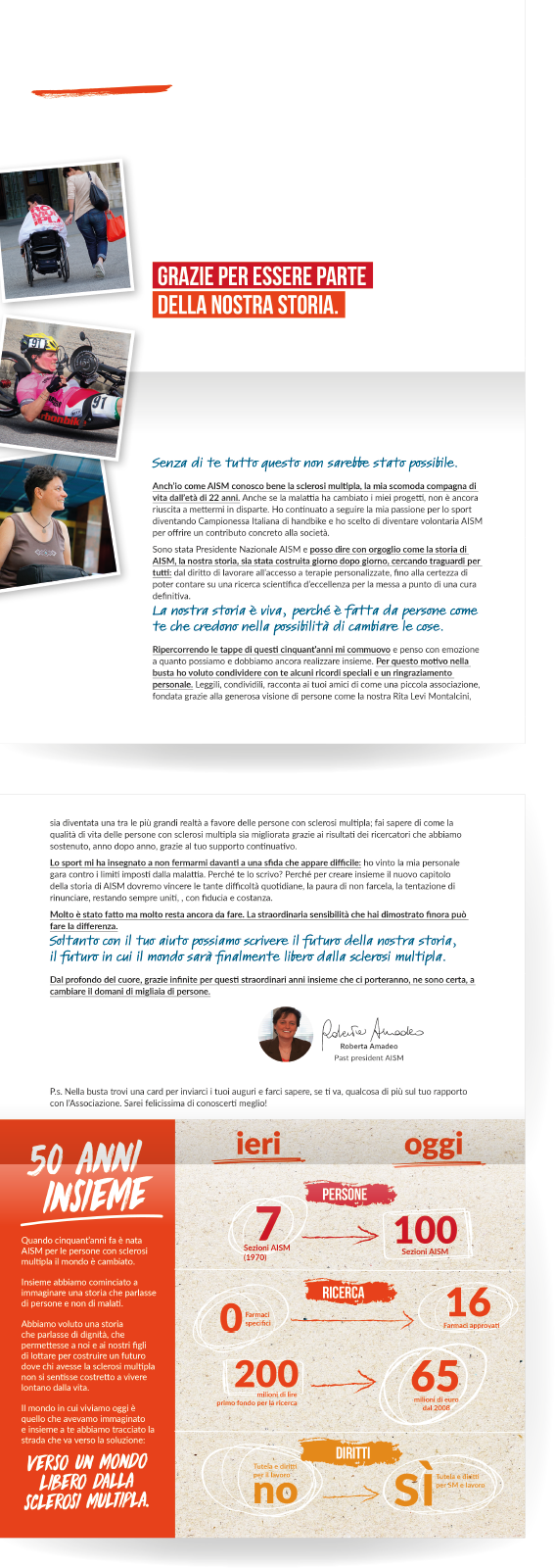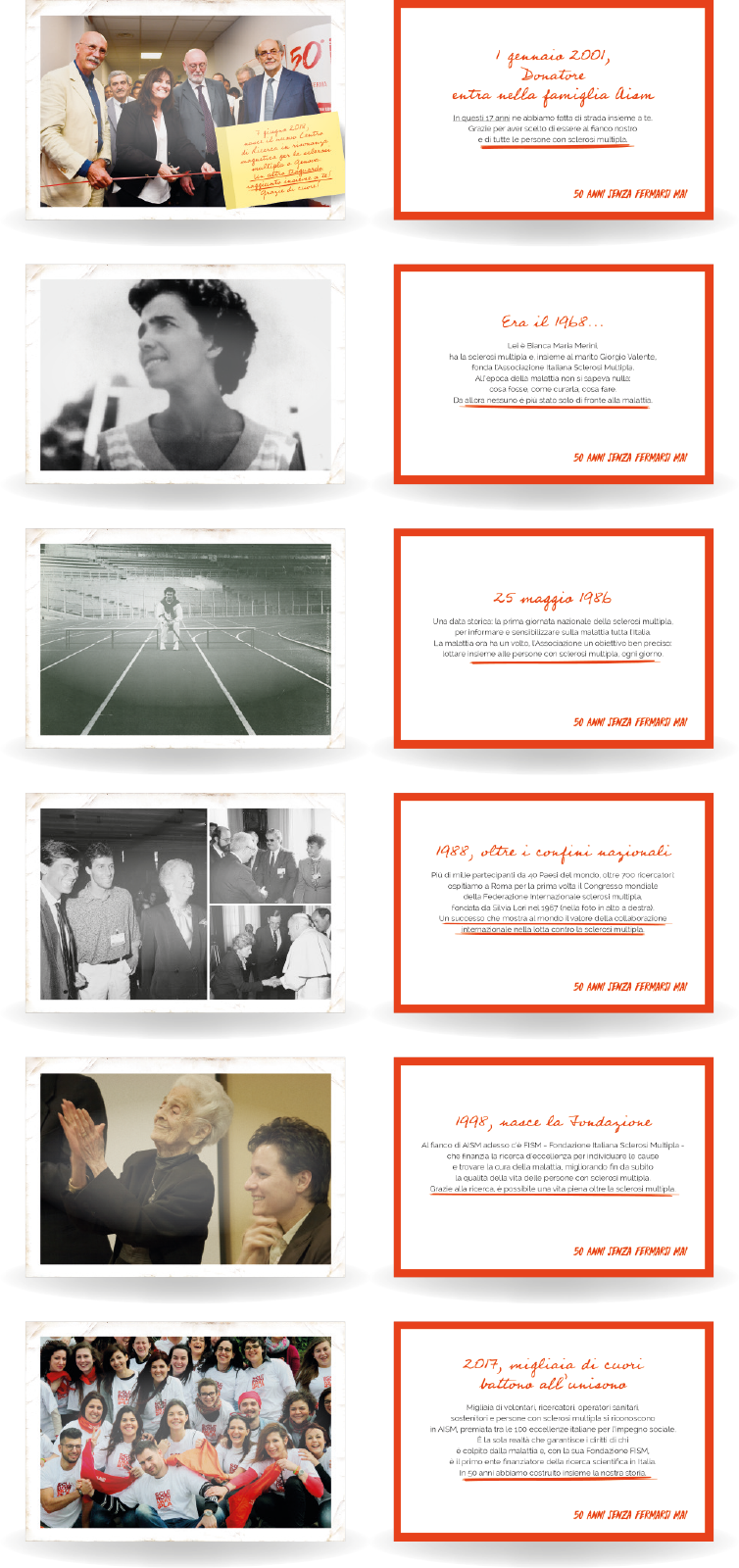 In occasione di un compleanno importante abbiamo voluto raccontare la storia di AISM con 6 cartoline: una per decennio più una speciale, quella legata alla prima donazione del destinatario perché anche lui fa parte della storia dell’Associazione.