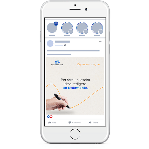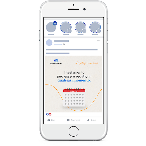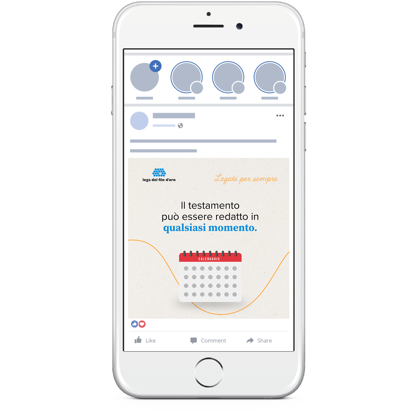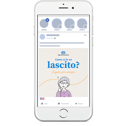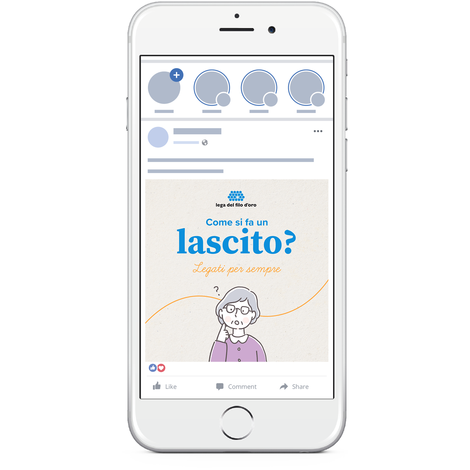 Ci occupiamo della gestione dei lasciti di Lega del Filo d'Oro. Con loro abbiamo sviluppato un percorso di relazione con il donatore che ha come obiettivo quello di comprenderne gli interessi e fornire tutte le informazioni utili per la scelta. Oltre ai materiali informativi abbiamo ideato delle rubriche video per avvicinare le persone a questa tematica e seguiamo la comunicazione digitale, ideando un PED per Facebook, Instagram e Linkedin composto da caroselli, immagini statiche, storie e video.